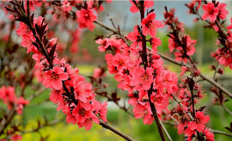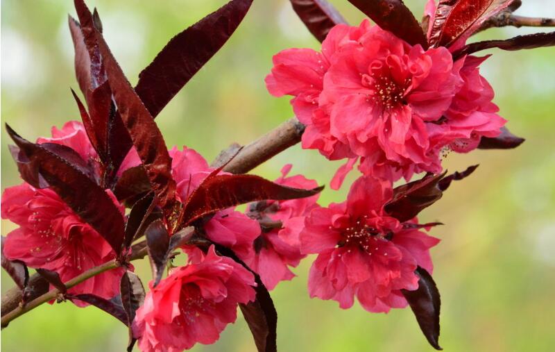 紅葉碧桃是先花后葉,屬于早春開花的植物,于3月份開始進入花期,4月份迎來盛花期,每朵花平均在10-15天左右,紅葉碧桃花大色艷、嫵媚可愛,是優(yōu)良的觀花樹種,還可自花授粉。