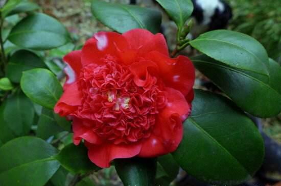 火瀑布山茶花,看其名能想到其花色肯定是如火般鮮艷的紅,花朵碩大為牡丹花型,外部花瓣包圍著內(nèi)部緊簇生長的花瓣,有如灑上去的白色斑點(diǎn),花期較長在1~4月份。