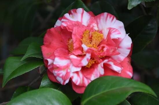 皇冠山茶花為花牡丹山茶花的變種,花色為紅白混合交叉,由于花色和杜鵑品種的皇冠靠近,所以也沿用“皇冠”為其名。花期在1~2月份。